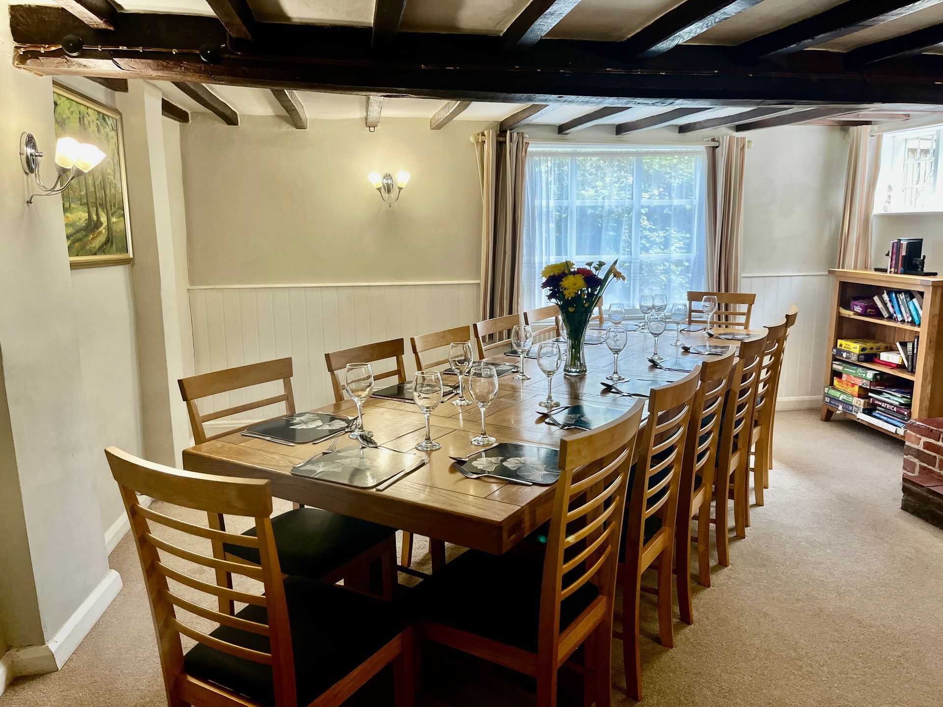Separate dining room with exposed beam ceiling, with large rectangle solid wood table with comfortable seating for 12 guests. Perfect for family get-togethers.