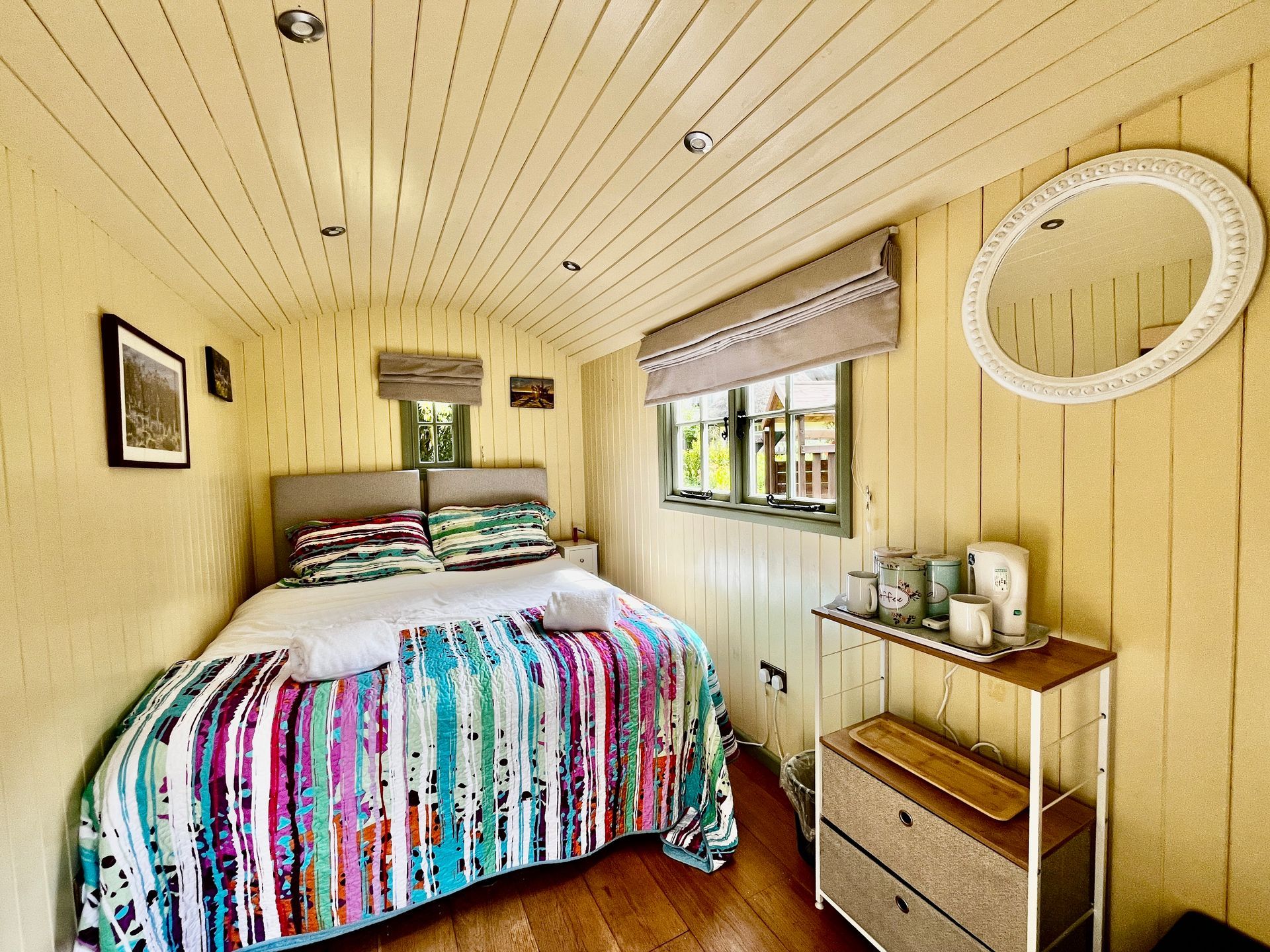 1 Double bedroom in Shepherds hut in garden.